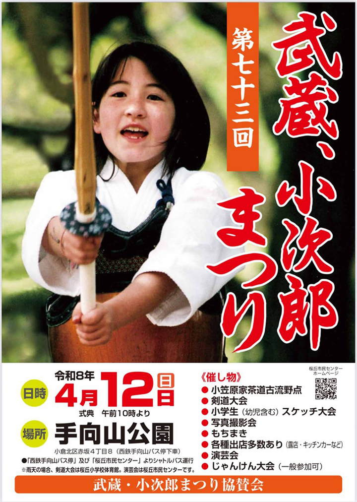令和8年4月12日(日)に手向山公園(小倉北区赤坂)で行われる第73回「武蔵小次郎まつり」に小倉城武将隊の宮本武蔵・佐々木小次郎が出陣いたします。「小倉城ものがたり〜武蔵・小次郎編〜」の巌流島の決闘シーンを披露します。